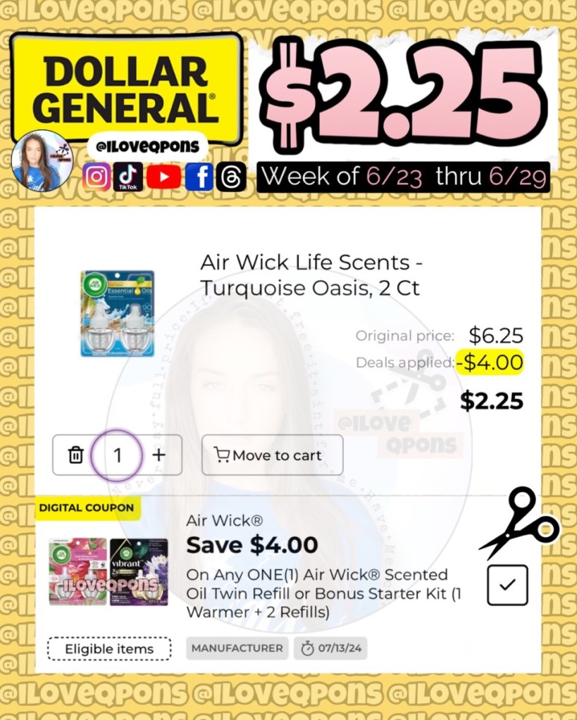 – Buy one Air Wick Oil Refill (TURQUOISE OASIS) 2CT at $6.25 and clip $4/1 digital coupon (EXPIRES 7/13/24)