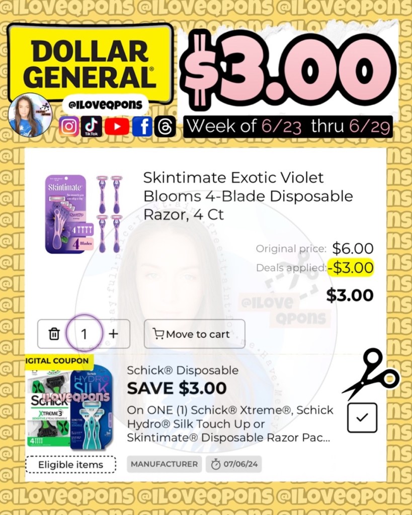 -Buy one Skintimate Violet Blooms Disposable Razor (4CT) at $6.00 and clip $3/1 digital coupon (EXPIRES 7/6/24)