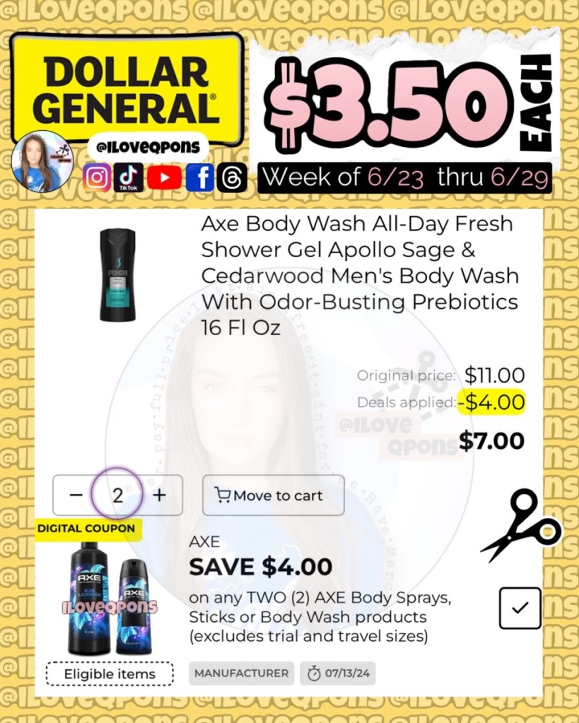 – Buy two Axe Body Washes at $5.50 each ($11.00) and clip $4/2 digital coupon (EXPIRES 7/13/24)