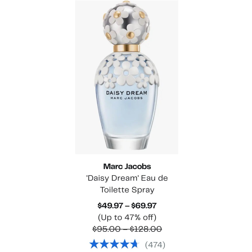 - Marc Jacobs ‘Daisy Dream’ Eau de Toilette Spray 1.7oz OR 3.4oz $49.97 – $69.97 (47% OFF – Regular $95 – $126)