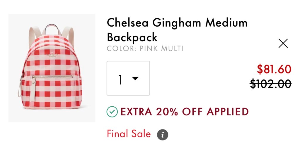 The Chelsea Gingham Medium Backpack (along with other various backpack styles) are normally priced at $299, but currently sitting at $102 (66% off). Code SELECT20 brings that down an additional $20, making it only $81.
